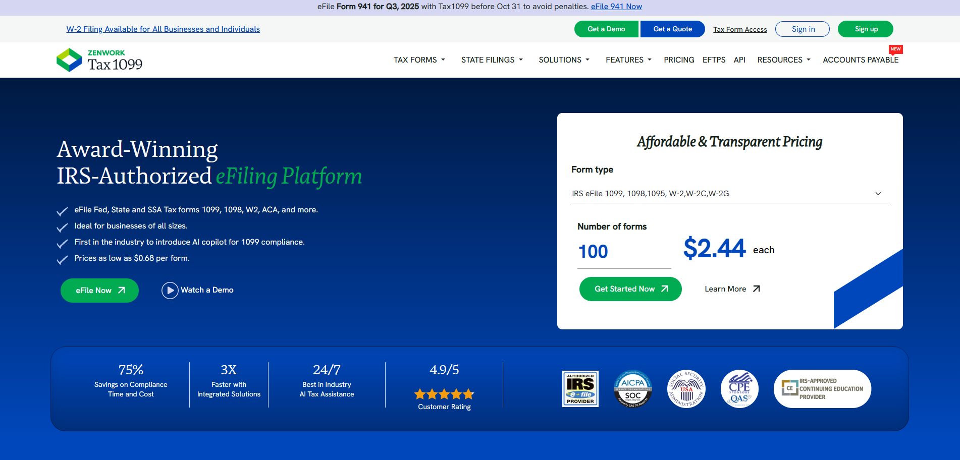 eFile Form 941 for Q3, 2025 with Tax1099 before Oct 31 to avoid penalties. eFile 941 Now