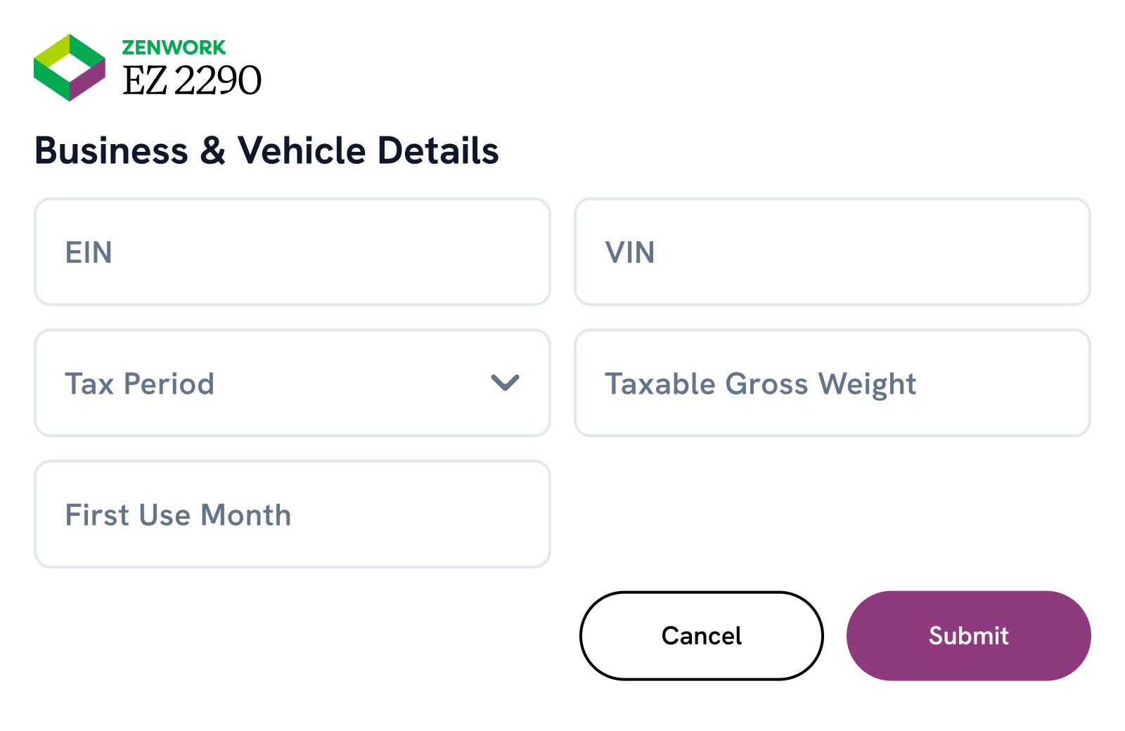 Provide business and vehicle details including EIN, VIN, tax period, taxable gross weight, and first-use month.