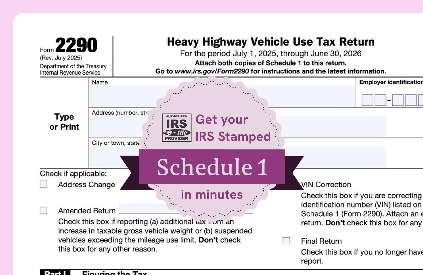 Simple and quick Form 2290 filing workflow to help you get stamped Schedule 1 immediately after IRS accepts the form.
